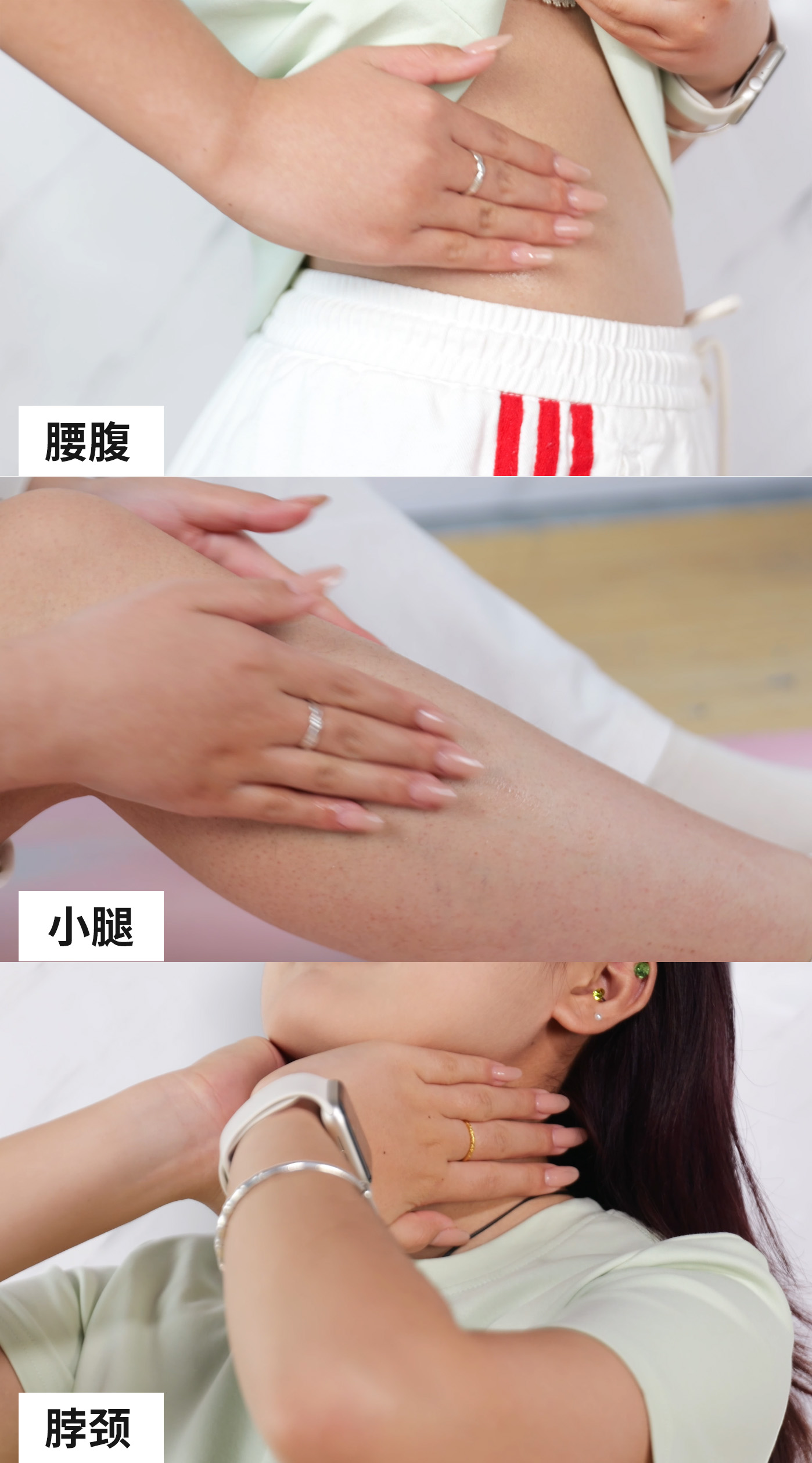取適量伯科®纖體塑形健美液(質地清爽不黏膩?。?,涂抹在你需要塑形的部位,用溫熱掌心包裹,或指尖輕柔打圈按摩,幫助精華嗖嗖滲入 肌膚深層——是時候對“蝴蝶臂”、“啤酒肚”、“水桶腰”或“浮腫腿”說拜拜啦!