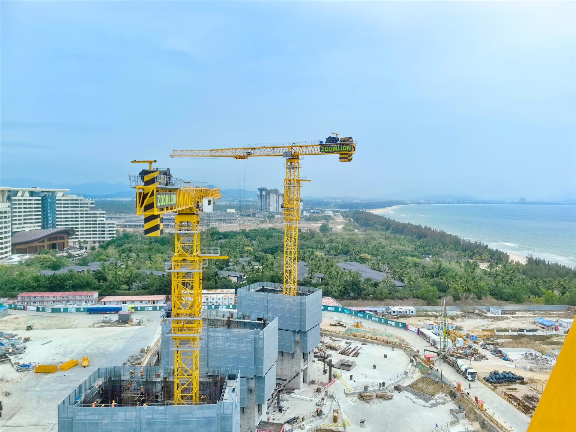 海光瀲滟、暖風輕拂,海南三亞春光正好。背靠綿延的海岸線,中聯(lián)重科3臺R代大型塔機挺立,正如火如荼地建設三亞國際免稅城一期二號地酒店這一新地標,成為保障項目建設的“定海神針”。