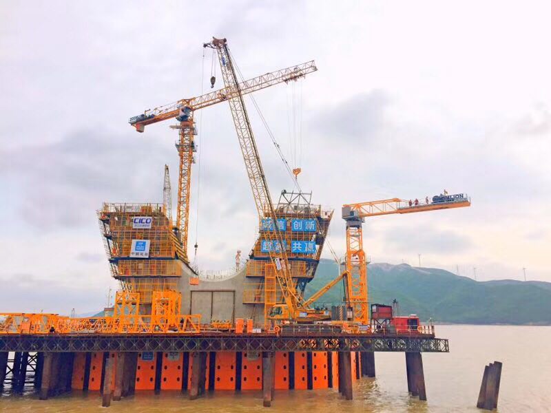 ▲中聯(lián)重科塔機助建舟岱跨海大橋
