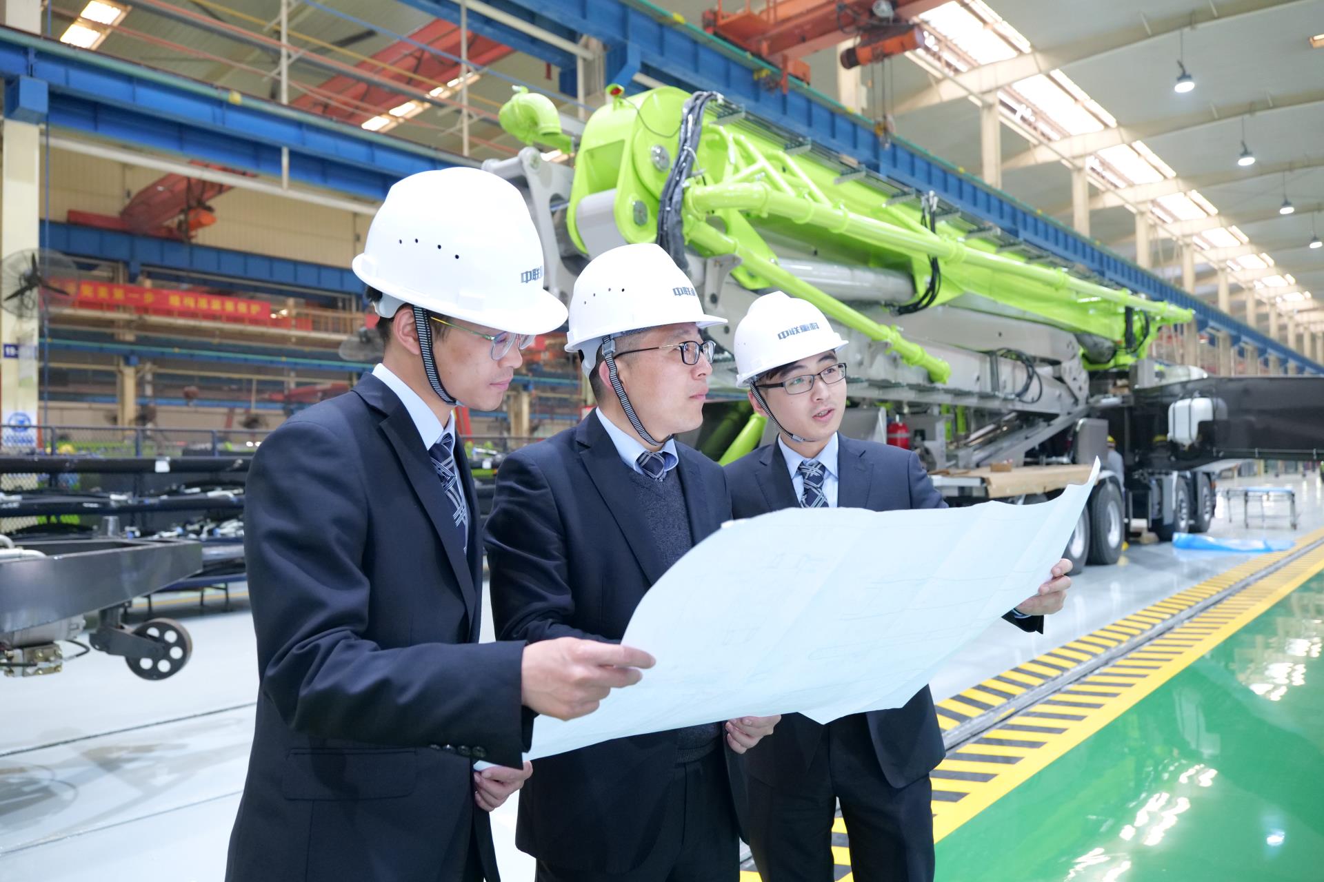 中聯(lián)重科混凝土泵送機(jī)械分公司研發(fā)中心經(jīng)理高榮芝(左一)在車間研究泵車裝備。朱莉 攝