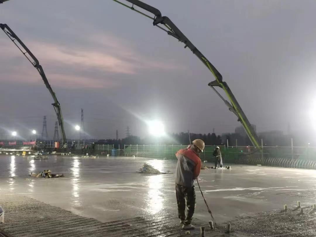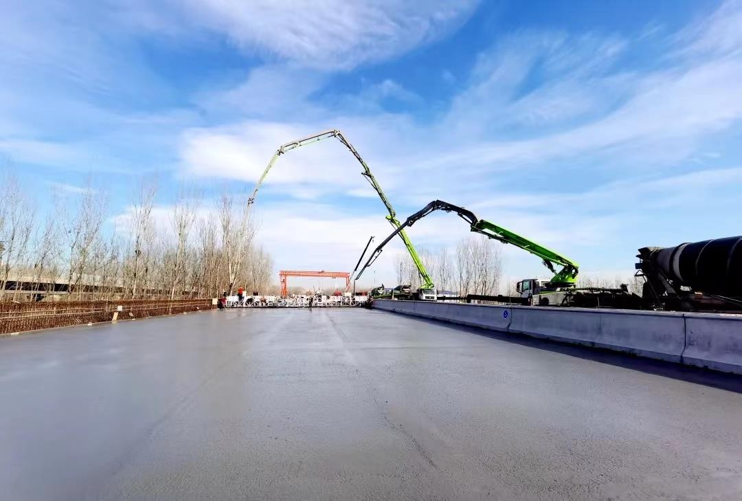 京雄高速公路(北京段)全線單跨**大跨70米現(xiàn)澆梁上跨南水北調(diào)+綠洲西路**后一聯(lián)的澆筑,需要的混凝土方量大、作業(yè)時間長、澆筑工藝復雜。為保證澆筑施工過程順利進行,確保混凝土施工質(zhì)量,在混凝土澆筑前,項目方針對混凝土澆筑的各項工作進行了精心部署,并選擇用中聯(lián)重科泵車來進行施工,保證人員、機械等滿足現(xiàn)場施工需求,保證施工現(xiàn)場安全質(zhì)量可控。