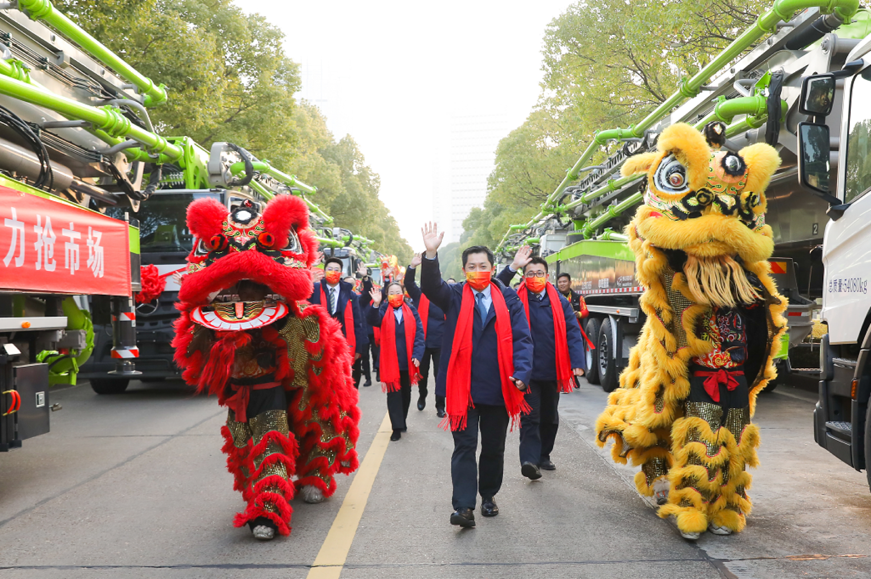 ????? 1月27日,正月初六上午8:08,中聯(lián)重科麓谷工業(yè)園龍獅齊舞、鑼鼓喧天,在一片熱鬧喜慶的氛圍中,中聯(lián)重科混凝土泵送機(jī)械新春“開門紅”暨全球發(fā)車儀式隆重舉行。