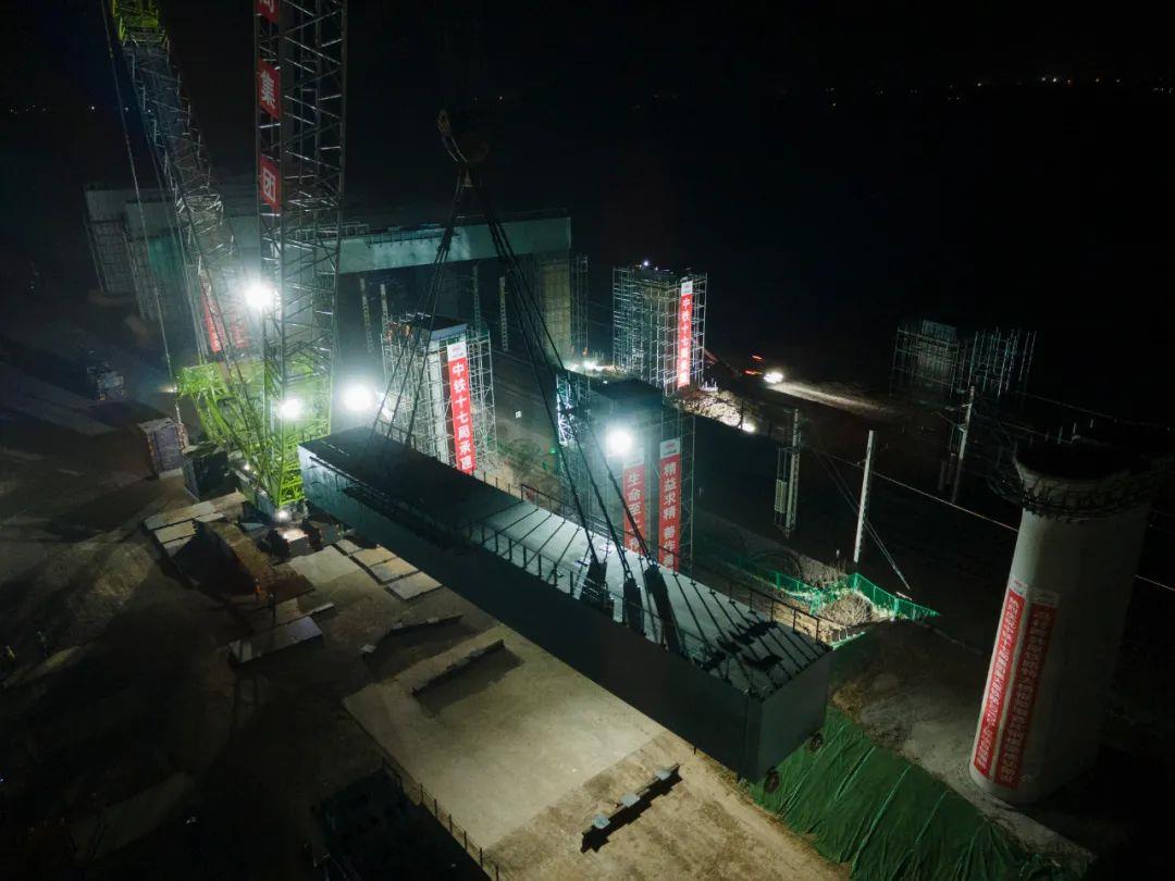 由于韓原鐵路客、貨運(yùn)輸非常繁忙,施工只能選擇夜間11點(diǎn)半到次日凌晨1點(diǎn)半,在這兩小時(shí)內(nèi)封鎖施工。項(xiàng)目方聯(lián)合專家組共同優(yōu)化鋼橫梁吊裝施工方案,選用了山西恒鑫順通工程機(jī)械設(shè)備租賃有限公司旗下的中聯(lián)重科千噸級(jí)履帶吊承擔(dān)重任。