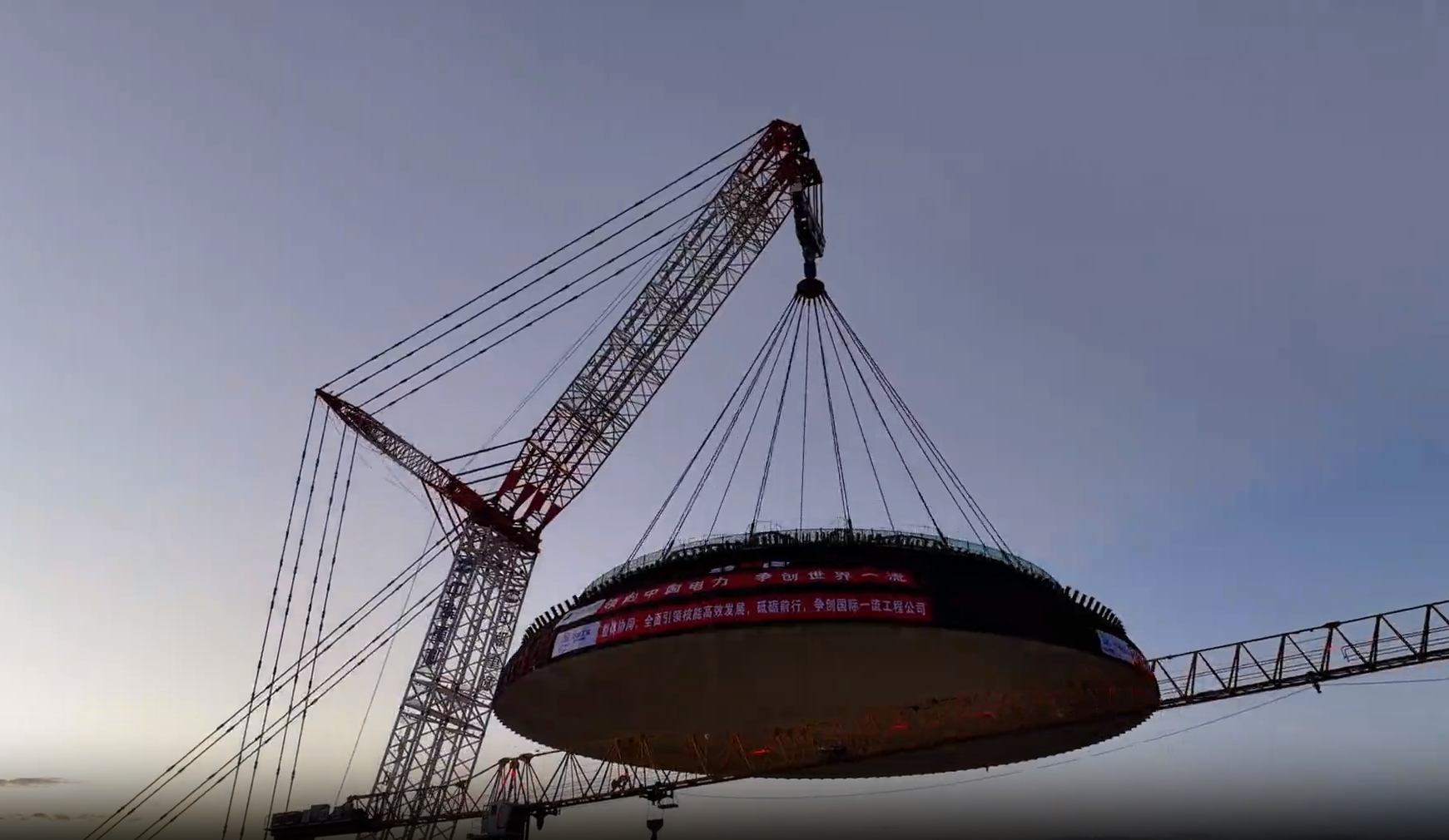 此次吊裝的外穹頂模塊吊裝負(fù)載總重量約為600噸,外穹頂結(jié)構(gòu)具有大尺寸、大重量且薄壁板的特性,吊裝過程極易產(chǎn)生形變導(dǎo)致就位困難,中聯(lián)重科3200噸履帶起重機(jī)以毫米級(jí)的吊裝精度和平穩(wěn)高效的吊裝動(dòng)作,將昌江核電二期3號(hào)機(jī)組外穹頂精準(zhǔn)地落在預(yù)定位置。