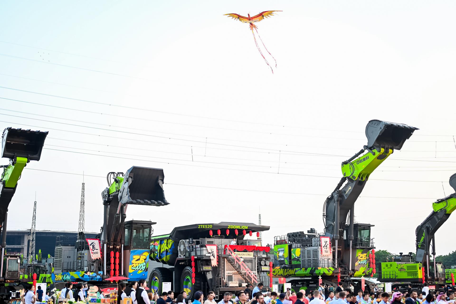 △中聯(lián)重科打造的全球**大噸位混合動(dòng)力電傳動(dòng)礦用自卸車ZTE520、超大型礦用液壓挖掘機(jī)ZE4000G等系列高端產(chǎn)品集中展示。