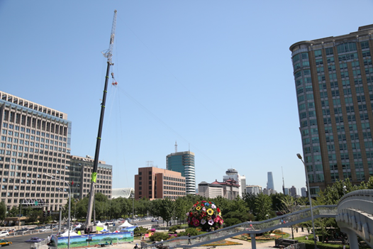 首先亮相的是QY80大型起重機(jī),它的工作是負(fù)責(zé)定位支撐首次在重大活動(dòng)中亮相的央視自主知識(shí)產(chǎn)權(quán)創(chuàng)新產(chǎn)品——天鷹座。QY80起重機(jī)位于人民大會(huì)堂西側(cè),由南向北拉起橫跨長(zhǎng)安街的拍攝索道,主要是用于正面拍攝閱兵隊(duì)伍行進(jìn),在電視直播畫面中看到的50支閱兵方針依次通過(guò)天安門廣場(chǎng)的正面鏡頭,就離不開它的功勞。