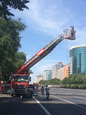 位于長(zhǎng)安街南側(cè),人民大會(huì)堂附近的是亞洲目前**高的云梯消防車,型號(hào)為YT60的中聯(lián)重科60米云梯消防車。它主要承擔(dān)了兩項(xiàng)重要任務(wù),前期主要配合QY80起重機(jī)進(jìn)行“天鷹座”的牽線工作;而在慶典當(dāng)天,央視工作人員在YT60撐起的工作斗里進(jìn)行現(xiàn)場(chǎng)拍攝,電視中許多天安門城樓上領(lǐng)導(dǎo)、嘉賓以及受閱部隊(duì)通過(guò)天安門前的正面鏡頭就是由它捕捉的。