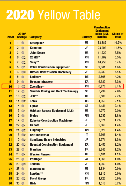 ? ?近日,英國(guó)KHL集團(tuán)發(fā)布了一年一度的全球工程機(jī)械制造商50強(qiáng)排行榜《2020 Yellow Table》。榜單顯示,中聯(lián)重科以60多億美元的銷(xiāo)售總額位列榜單前十強(qiáng),充分凸顯了中聯(lián)重科近年來(lái)取得的高質(zhì)量、高效率、可持續(xù)發(fā)展成果。