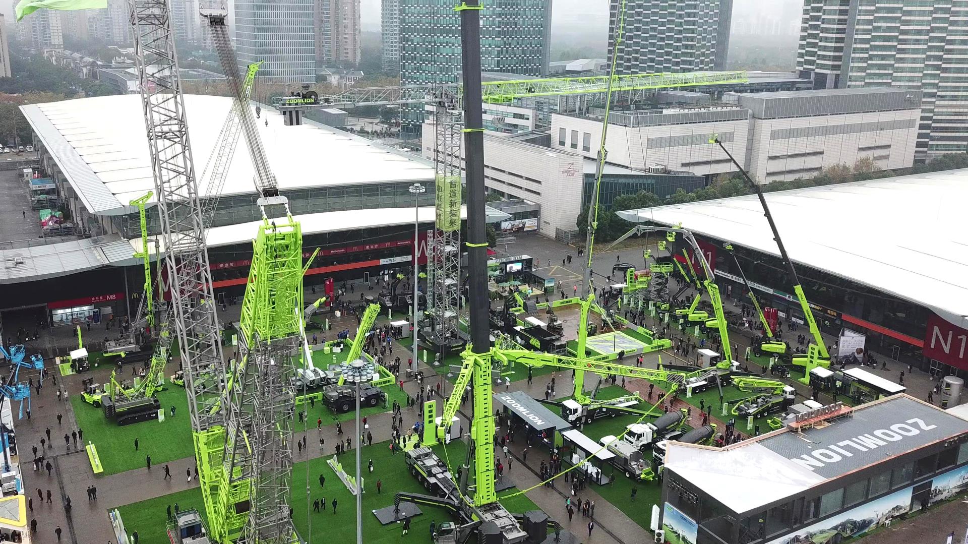 從上海新國際博覽中心3號門進入展場,首先映入眼簾的便是中聯(lián)重科展區(qū),公司工程起重機械、建筑起重機械、混凝土機械、樁工機械、土方機械、高空作業(yè)機械、工業(yè)車輛、m-tec干混砂漿施工設(shè)備、礦山機械等9大類產(chǎn)品錯落有致,分門別類擺放在各個展位,50余款產(chǎn)品匯聚成一片“極光綠”的海洋,甚為壯觀。