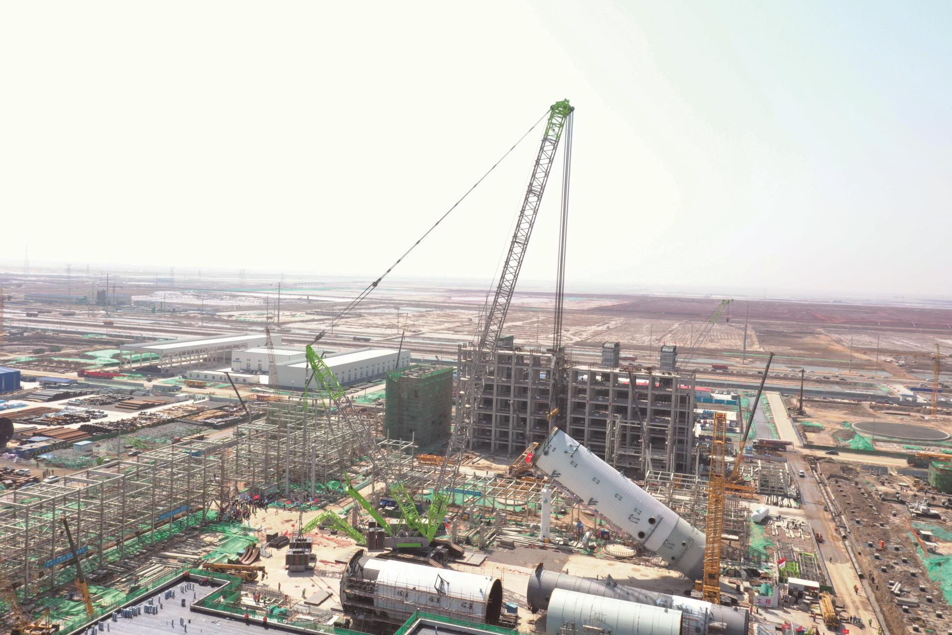 其中,丙烯丙烷分離塔是丙烷產(chǎn)業(yè)鏈項(xiàng)目的核心設(shè)備之一,用于分離丙烯與丙烷。該項(xiàng)目中,丙烯丙烷分離塔重達(dá)770噸,相當(dāng)于500多臺(tái)小汽車的重量,吊裝難度可想而知。為確保吊裝一次性成功,項(xiàng)目決定使用吊裝經(jīng)驗(yàn)豐富的中聯(lián)重科設(shè)備作業(yè)。