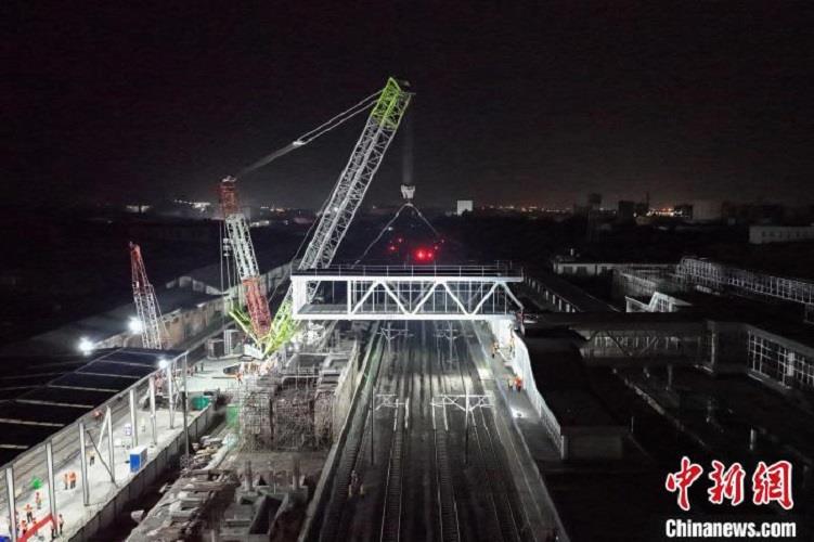 凌晨4點(diǎn),夜幕低垂,正是好夢(mèng)之時(shí),南昌南站(橫崗站)外燈火通明,中聯(lián)重科起重機(jī)和現(xiàn)場(chǎng)施工人員嚴(yán)陣以待。隨著“就位”命令下達(dá),歷時(shí)2個(gè)小時(shí),中聯(lián)重科650噸履帶吊順利將106噸重的鋼桁架天橋橫跨4條鐵路營(yíng)業(yè)線上方精準(zhǔn)落位。