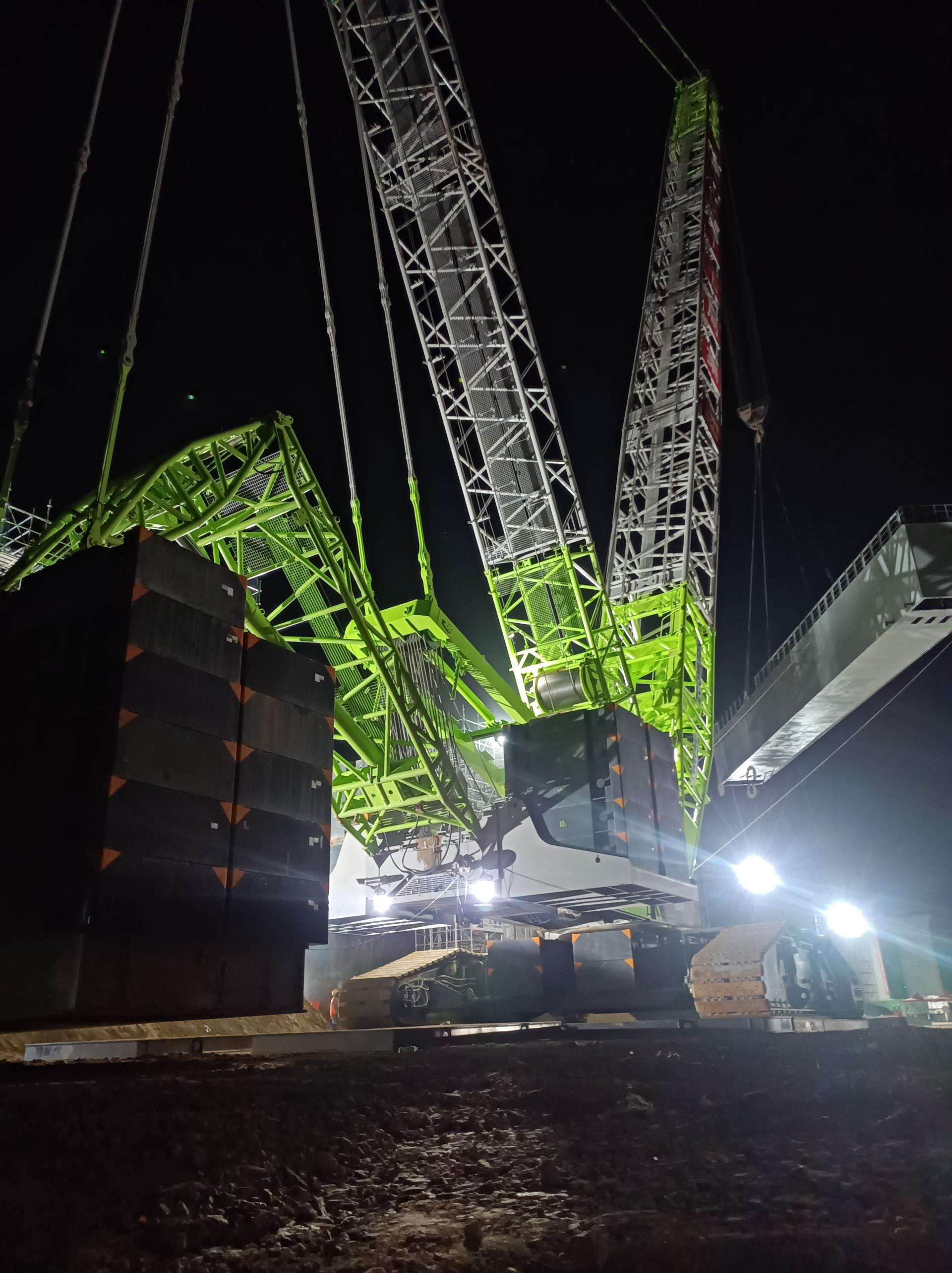 在中聯(lián)重科履帶吊吊裝的鋼橫梁中,有一榀長(zhǎng)33.84米,寬4.58米,高3.5米,重達(dá)276.4噸,需要將其吊至離地面18米,相當(dāng)于6層樓的高度,還要平穩(wěn)落在框架墩上,偏差要控制在毫米級(jí),即使風(fēng)力的影響都要嚴(yán)格計(jì)算,做到“繡花”一樣精細(xì)。4月20日凌晨,中聯(lián)重科千噸級(jí)履帶吊穩(wěn)穩(wěn)起吊橫梁,旋轉(zhuǎn)、擺正、下落、校正一氣呵成,施工用時(shí)不到30分鐘,贏得項(xiàng)目部高度贊譽(yù)。