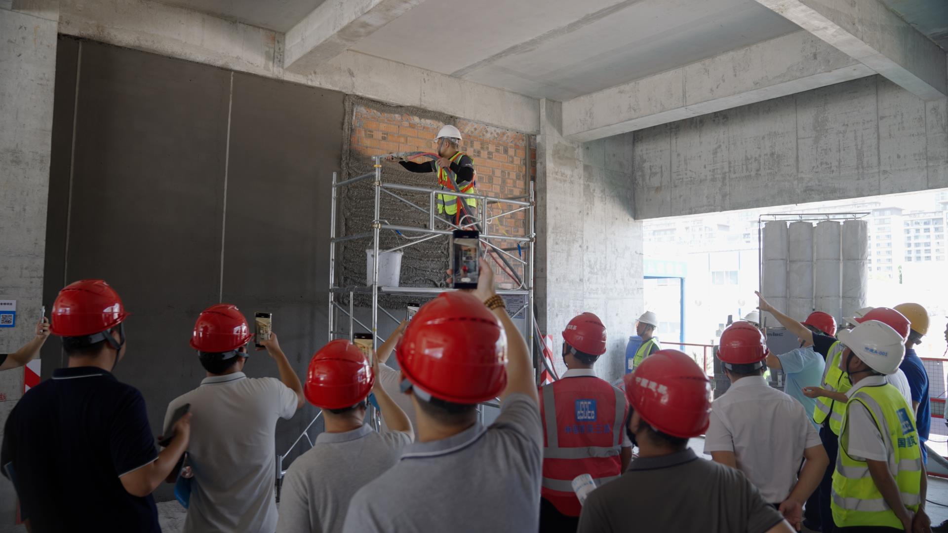 除了智能化施工裝備,中聯(lián)重科還展示了智能化的墻面施工解決方案。該方案使用新材料水泥基輕質(zhì)砂漿,不僅耐水、防潮、防霉,還能賦予墻面保溫、隔熱、隔音的功能。“GDP/Duomix+機械化施工的新工藝工法”,則通過多環(huán)節(jié)運用傳感器聯(lián)動,實現(xiàn)了“智能化運作,一鍵啟?!?,施工現(xiàn)場無粉塵排放,無干粉濕漿落地,無需清洗輸送管道,具有安全、高效、綠色環(huán)保等顯著優(yōu)勢。