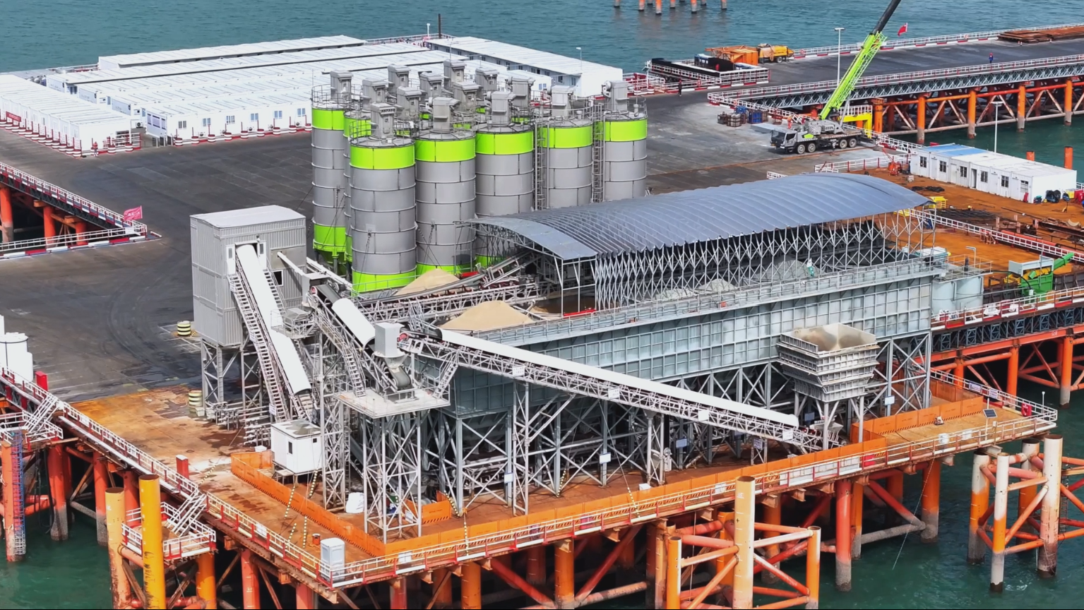 離岸施工建設(shè)難度大,結(jié)構(gòu)耐久性要求高。如何降低強(qiáng)風(fēng)、海水侵蝕等影響,提升作業(yè)效率成為攪拌站建設(shè)重點(diǎn)。中聯(lián)重科充分考慮海上安裝、施工特殊工況,融合海上固定平臺(tái)及鋼管樁結(jié)構(gòu)進(jìn)行定制化設(shè)計(jì)。其中,HZS180R集裝箱攪拌站整機(jī)采用模塊化設(shè)計(jì),模塊內(nèi)部管線廠內(nèi)預(yù)裝,模塊間管線采用快速接頭連接,每層模塊在地面組裝后整體吊裝,安裝更加便捷、安全,集裝箱式外封滿足抗臺(tái)風(fēng)要求。