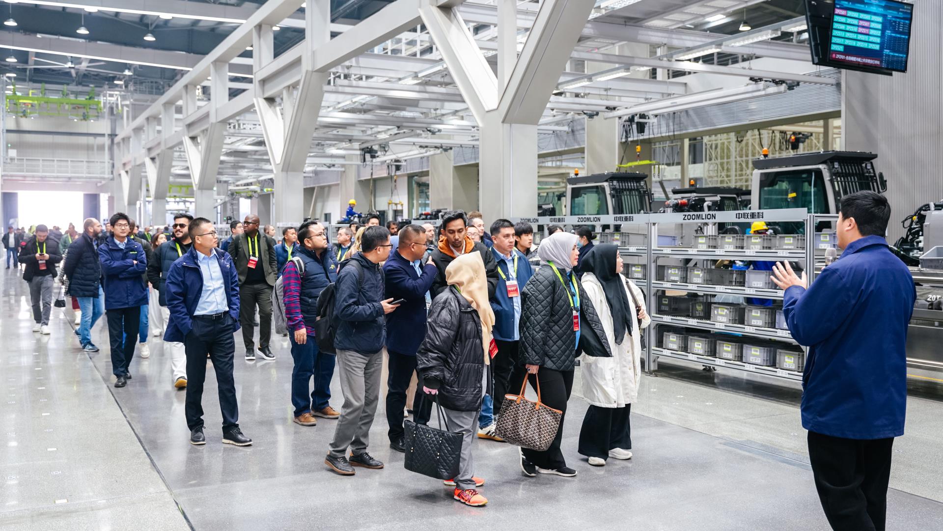 ▲客戶參觀中聯(lián)重科智能制造產(chǎn)線和設(shè)備演示