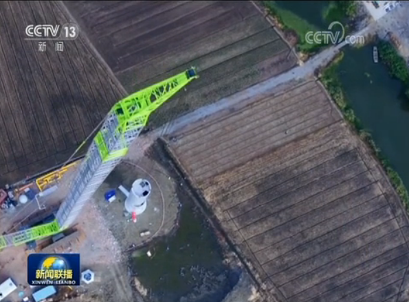 ▲央視新聞聯(lián)播報道截圖:正在吊裝作業(yè)的中聯(lián)重科履帶吊