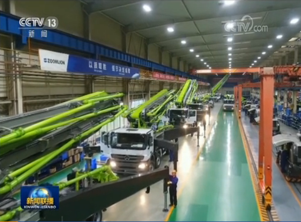 ▲央視新聞聯(lián)播報道中的中聯(lián)重科麓谷工業(yè)園泵車總裝車間