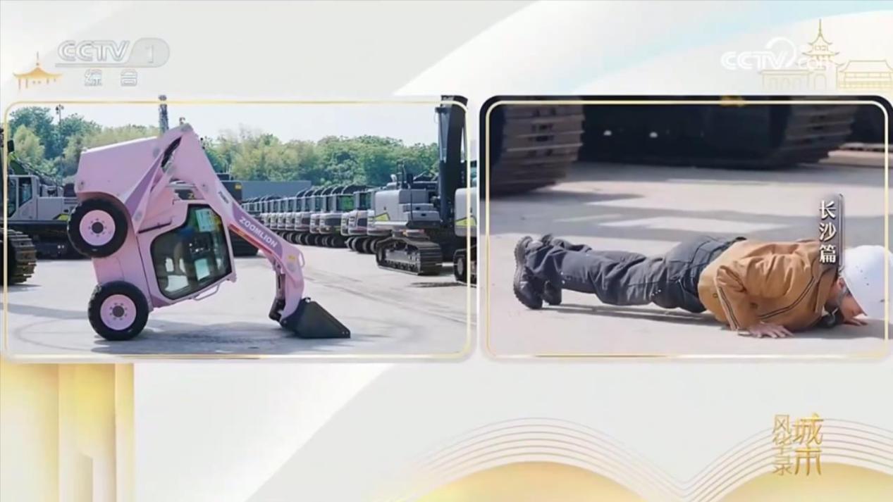 在土方機械園區(qū),風華團一行漫步在霸氣的“鋼鐵森林”中,兩側挖掘機“儀仗隊”用整齊劃一的抬臂向大家致意,后方汽車起重機、高空作業(yè)平臺如“孔雀開屏”,泵車在高空中展臂遙遙“比心”。兩臺滑移裝載機獻上酷炫的華爾茲表演,讓大家驚呼:“還能這樣!”“顏色粉嫩,實力不俗!”撒貝寧還興致勃勃地模仿了地面動作。
