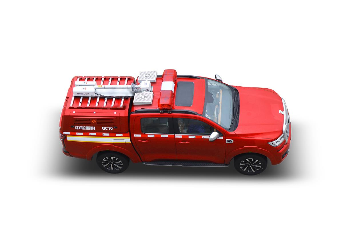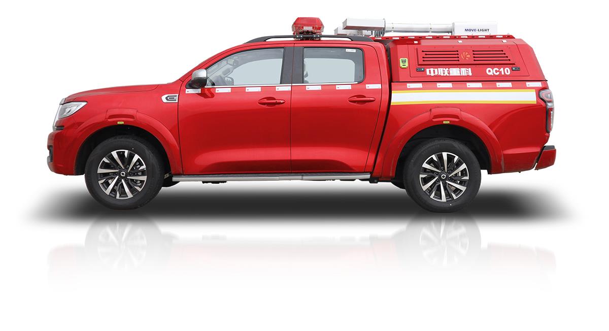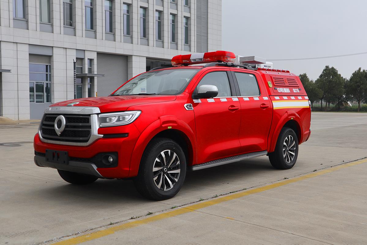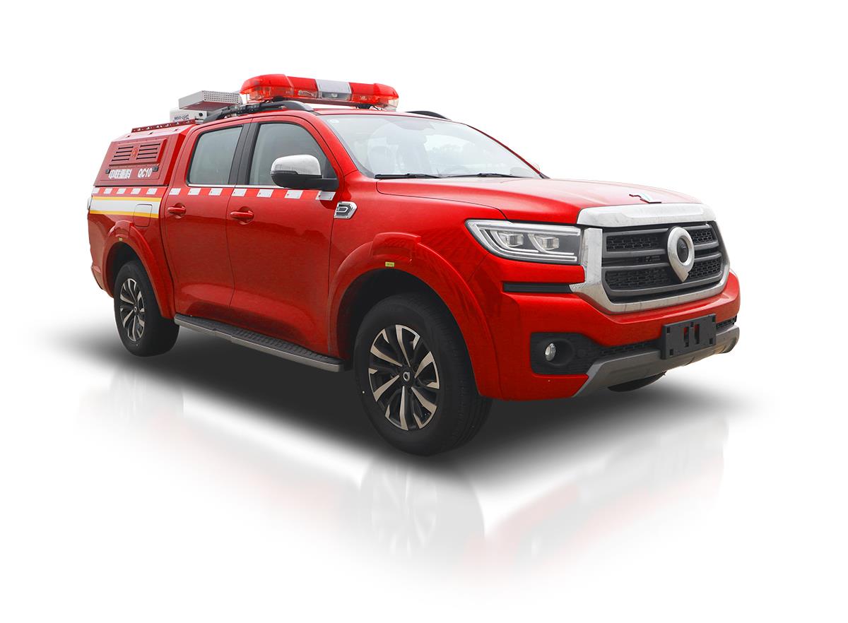 QC10A6型“平戰(zhàn)接合型”前突皮卡車,在救援隊(duì)伍行進(jìn)時(shí),起突前器材運(yùn)輸作用,用于搭載救援人員和消防器材快速到達(dá)事故現(xiàn)場(chǎng)。