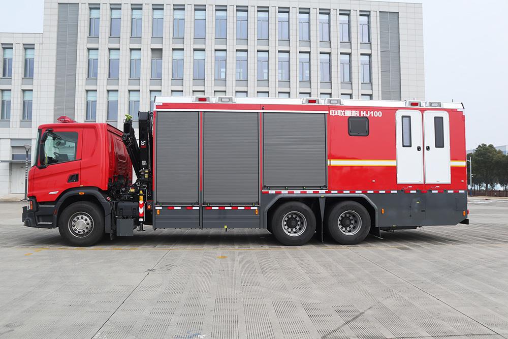 ? ? ? 中聯(lián)重科HJ100化學(xué)救援消防車是公司基于斯堪尼亞P500 6×4高性能底盤打造,集化學(xué)洗消、搶險(xiǎn)救援、照明、重型起吊等多功能于一體的多功能救援平臺(tái)。該車采用輕量化鋁合金車身結(jié)構(gòu),配備國際頂級子系統(tǒng)(包括比利時(shí)TEKLITE照明系統(tǒng)、冠軍7.5噸級電動(dòng)絞盤、希爾博起吊機(jī)等),可搭載100余件專業(yè)救援器材,集化學(xué)洗消、照明、供電、牽引、起吊、破拆、偵查、救援等功能于一體的多功能消防車;具備強(qiáng)大的搶險(xiǎn)和化學(xué)救援能力,可滿足化學(xué)泄漏、地震災(zāi)害、洪澇事故、車禍等復(fù)雜場景下的綜合救援需求,是國內(nèi)領(lǐng)先的模塊化多功能救援平臺(tái)。